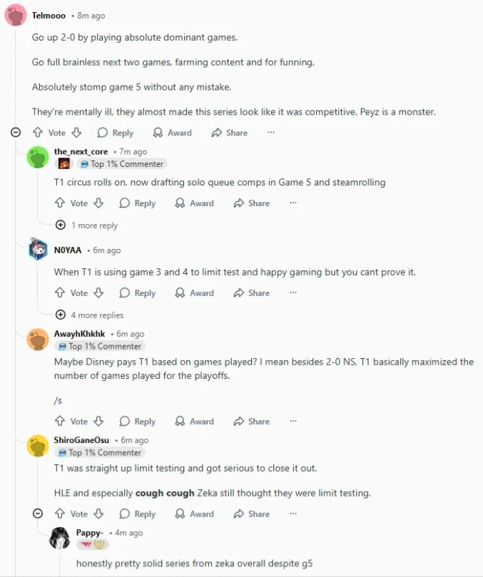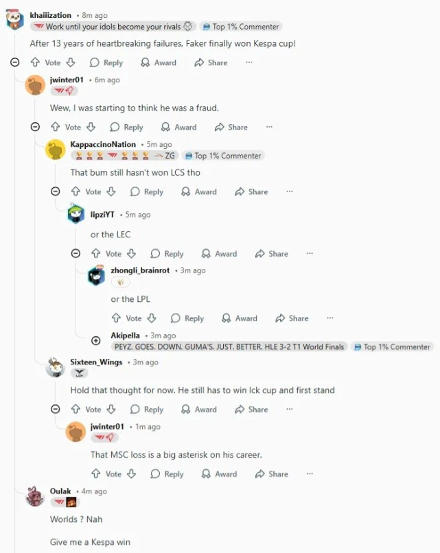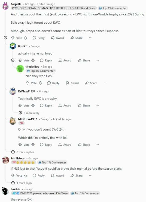 直播吧12月14日讯在刚刚结束的2025KeSPA杯决赛T1对战HLE的比赛中,T1以3-2成功战胜HLE夺冠,这场比赛也引发了Reddit网友的热议;