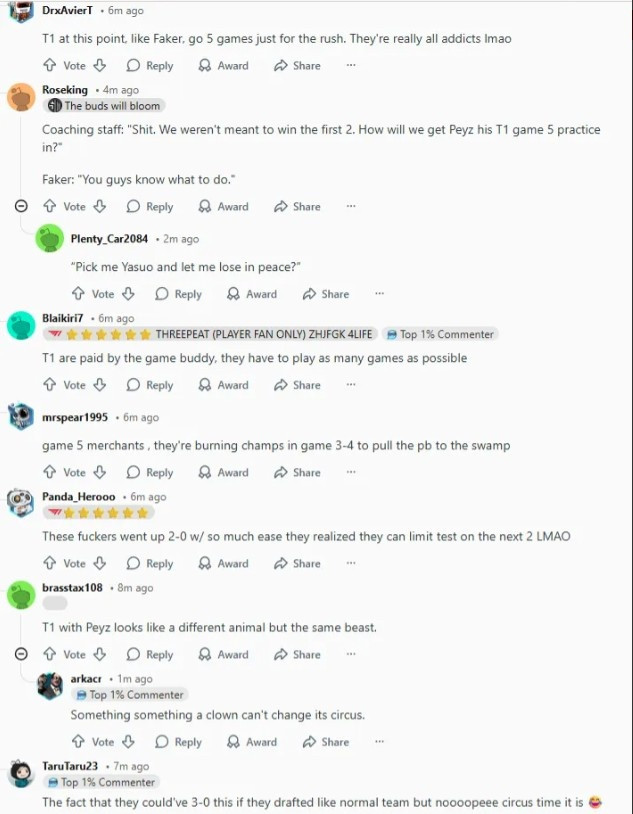 T1在这个时间点,就像Faker一样,打满五局只是为了寻求刺激。他们真的都上瘾了,哈哈。